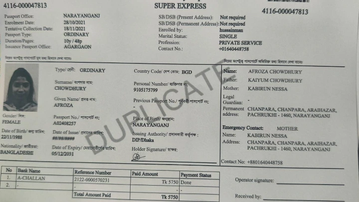নারায়ণগঞ্জ পাসপোর্ট অফিসের অগ্নিকাণ্ড ও সার্ভার ক্ষতির কারণে চার বছরেও নাগরিক আফরোজা চৌধুরী পাসপোর্ট পাননি”