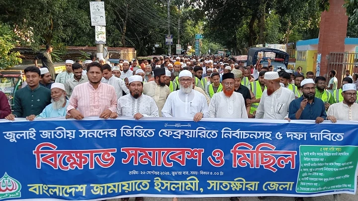 জুলাই জাতীয় সনদের ভিত্তিতে ফেব্রুয়ারিতে জাতীয় নির্বাচনসহ ৫ দফা দাবিতে বাংলাদেশ জামায়াতে ইসলামী সাতক্ষীরা জেলা শাখার উদ্যোগে বিক্ষোভ মিছিল ও প্রতিবাদ সমাবেশ অনুষ্ঠিত হয়েছে।